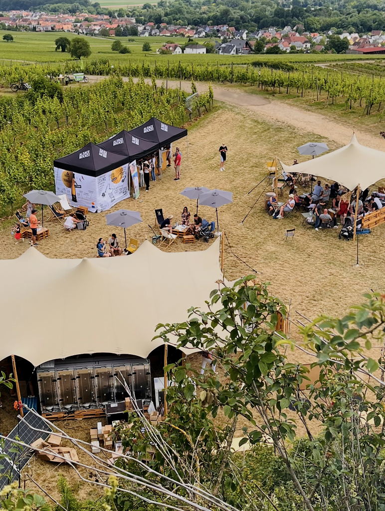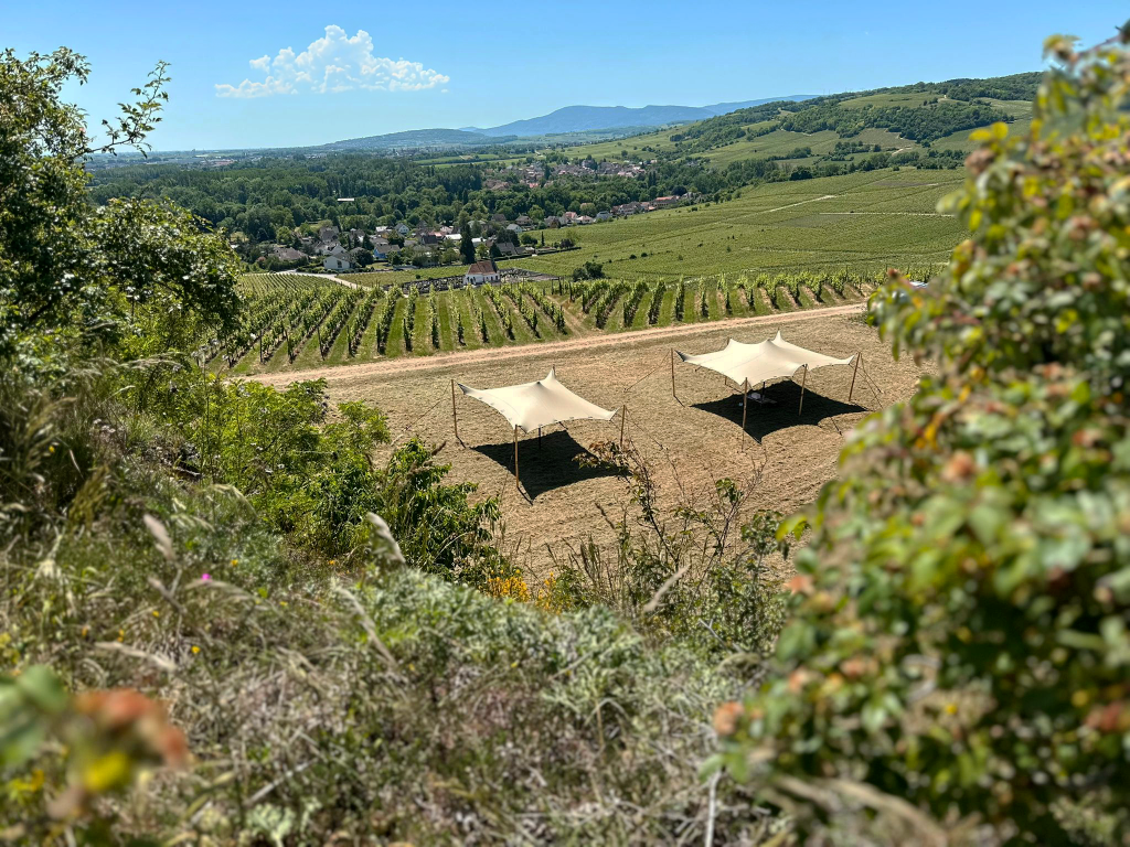 5 structures élégantes installées au cœur des vignes, créant des espaces ombragés et conviviaux pour déguster, échanger et profiter de concerts ou d’animations dans une ambiance détendue et naturelle.
